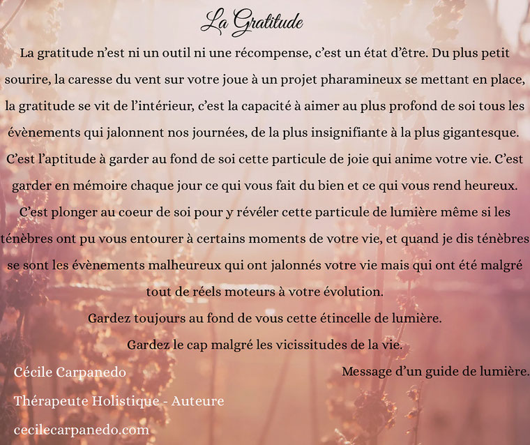 J’essaie de mon mieux, avec tout mon cœur et mon être, avec toutes mes qualités et mes défauts d’aimer et d’aider, c’est ma seule richesse et j’en suis fière. J’acceptes de ne pas avoir le chemin que voudrait de moi la société, j’acceptes de passer outre mes peurs et mes doutes pour continuer à vous accompagner au plus juste pour vous, pour faciliter votre propre pouvoir à vous guérir et à vous dépasser dans l’amour, l’écoute et la bienveillance. Et pour faire ce que je fais, je ne suis pas seule et vous non plus, j’ai une équipe lumineuse derrière moi, il est juste temps pour moi de lâcher les dernières amarres, les dernières résistances pour laisser exprimer ce que je suis vraiment. Je ne suis ni mieux ni moins bien que vous, je suis juste Cécile Carpanedo venue expérimenter et aider dans ce monde de matière !